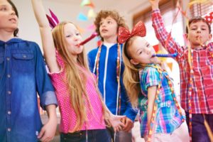 Dzieci tańczą do wesołej muzyki i otrzymują słodycze i herbatę jako nagrodę.